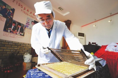 ![]() 待梨膏冷却后,一块块淡黄色晶莹剔透的梨膏糖块就制作而成了。 不久前的第十四届上海世界旅游博览会,设立了一个旅游纪念品专区。走走看看,又是一个老话题盘上心头:“魔都”怎么就没有什么“有魔性的”纪念品。 直到看见了梨膏糖和五香豆的展柜。曾经熟悉的味道勾起了儿时的回忆,忍不住上前和师傅们聊聊。 一问惊诧。上海梨膏糖还有15名师傅,每年产量200吨,“活”在金茂大厦的隔壁,手里拿着国内唯一一张允许添加药物生产食品的许可证;五香豆蜗居城隍庙不足30平方米的店面里,每天销售额5万元。厂里的老师傅,靠人工捧着25斤的竹筐子不停翻动20分钟,才能炮制出一筐独特的奶油香。 再问感慨。论起销售和利润,梨膏糖和五香豆算是“小确幸”的存在,但老师傅们大多还揣着不甘心———上海味道靠着坚守品质和不断创新活到了耄耋、活过了百年,难道现在就只能蛰伏? 三问,再忍不住想为上海味道做些什么。老师傅们说,活过了百年的梨膏糖和五香豆难道还不够“魔性”? 还有很“潮”的师傅说,日本和果子会讲故事、会拗造型,我们梨膏糖和五香豆的故事也要讲啊,年轻人也要一起来给上海味道拗造型啊。 是哦。那就让我们从梨膏糖和五香豆的故事开始讲起。 百余年前的那口紫铜锅依然飘着糖香 15名师傅每年熬制200吨上海梨膏糖 “卖梨膏糖咧”,还有多少上海人能够在儿时记忆中翻找出这一句抑扬顿挫的吆喝? 中国人一直相信药食同源,药食同补。老城隍庙的梨膏糖,是药,也是糖,苦中带甜,甜中带甘,就像人生。它不仅深藏在城市的记忆中,也浓缩了一段人文情怀。 今年第十四届上海世界旅游博览会上,这一块黑黑的、方方的已经有160多岁的小东西———梨膏糖,勾起了人们舌尖心底的回味。 是糖更是药 做梨膏糖要讲良心 今年64岁的李放敏是上海梨膏糖食品厂现任“掌门人”。1999年从纺织厂转到食品厂的他,一直说自己是这个老厂里的“新人”———虽然已做了18年的梨膏糖,但那古法风韵仍然令他着迷,让他至今还像一个小学徒那样孜孜不倦地吸取着其中的“精髓”。在位于浦东陆家嘴的上海梨膏糖食品厂,记者见到了李放敏。一见面,他就和记者打趣:“想不到梨膏糖是在上海的金融核心区生产出来的吧。” 李放敏说,如果从1855年上海老城隍庙开出第一家自产自销梨膏糖的店铺朱品斋算起,上海梨膏糖可以考证的历史已有162年。不过在传说中,梨膏糖的起源可以上溯到唐太宗那个年代:大臣魏征是个孝子,他母亲多年患咳嗽气喘病,却不肯服用苦药;魏征听医生讲梨子有止咳之效,便将治咳嗽的草药磨成粉,同梨汁一起煎熬成糖块;魏母吃得开心,不久咳嗽便治好了。 朱品斋,当年开在老城隍庙前门的石狮子旁。之后,庙西开出了永生堂,庙北的豫园门前开出了德甡堂。据史料记载,卖梨膏糖,有“文卖”和“武卖”之分。永生堂和德甡堂是“文卖”的代表:现做现卖,唱着曲儿吆喝吸引顾客。伙计在糖摊前摆个炉子,上面放只紫铜锅,左手拿一把竹爿,不断搅动铜锅里熬着的糖,不让糖粘底,右手拿一条尺把长的扁铁锉,将药料锉成粉末,一堆堆存在旁边的小木盘中;待锅内的糖熬到一定程度,便将药粉倒入,搅拌成梨膏糖。这把扁铁锉,既是锉药粉的工具,也是伴奏的乐器———左右各装上5个铜圈,锉药时甩动铁锉,10个铜圈便碰撞出悦耳之声,正好给唱曲伴奏。唱的什么? 是药名:“一包冰雪调梨膏,二用药味重香料,三(山)楂麦芽能消食,四君子打小囡痨……” 卖梨膏糖的,传说中不也叫“小热昏”吗? 不错,那就是对“武卖”的“定位”:身边放一副四脚架,上置一只小木箱,内装梨膏糖,箱盖上摆一块说书先生用的“醒木”;卖糖人又说又唱,说唱的多是时政新闻与小道消息,以此聚拢人气借机推销。在那个“莫谈国事”的年代,这样说唱冒点险,所以“武卖”的都自称“小热昏”,意思是自己在“发昏说胡话”,不必当真。 抛开“文卖”、“武卖”的噱头,上海梨膏糖其实主打的就是“止咳”———穷人看不起病,花几个铜板调点糖配点止咳草药。但咳嗽病因有很多种,一块梨膏糖终究不能包治百病,但在那个时代,有药有糖,是穷人患病后最大的依托。 是糖,更是药。李放敏永远记得进厂第一天———那一天,厂里的老师傅一脸严肃地说:“梨膏糖是糖,但它又不是普通的糖,它更是药。做药,要凭良心。” 看糖浆气泡有门道 在梨膏糖生产车间里,最引人瞩目的就是那十几口紫铜大锅。李放敏说:“我们这里最老的紫铜锅已经有100多年了,至今还在使用———不用紫铜锅,出来的味道就是不一样。” 梨膏糖,黑黑方方一小块,却是个易学难精的手艺:学会只需两三个月,但要窥得其中门道,至少得两三年。洗药、选药、熬药、搅拌……每一环节都容不得半点疏忽。李放敏刚进厂时跟的是德甡堂梨膏糖曹氏二代传承人曹师傅,“可能是我悟性不够吧,直到曹师傅退休也没有正式收我为徒,这是我最大的遗憾。” 梨膏糖制作,包括配料、熬糖、翻砂、浇糖、平糖、划糖、划边、刷糖、翻糖、掰糖、包装等多道工序。其中最有技术难度的是熬糖,这决定着梨膏糖的质量好坏。配好的药粉与糖、水按一定比例混合,在紫铜锅里熬煎时,温度要保持在130℃到135℃之间。但糖加热到120℃之后,开始变得极为“调皮”,温度会直线上蹿,稍不留意锅底就糊了;倘若温度超过了