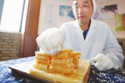 经过冷却、划糖等步骤,梨膏糖被分割成了一块块小方格。