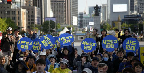 这是4月27日拍摄的韩国民众在首尔光化门广场参加反对部署“萨德”集会的资料照片。新华社记者姚琪琳摄