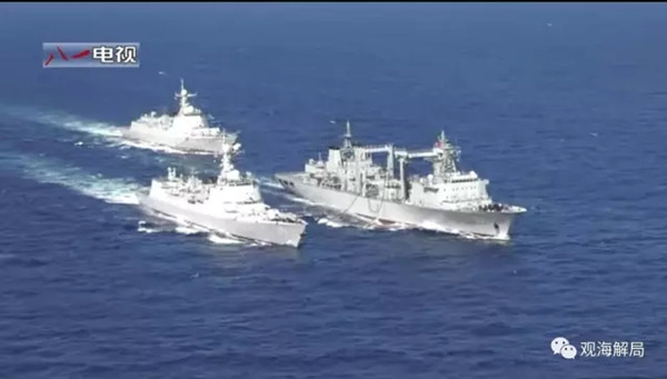 (骆马湖舰【右】补给长沙舰、海口舰)