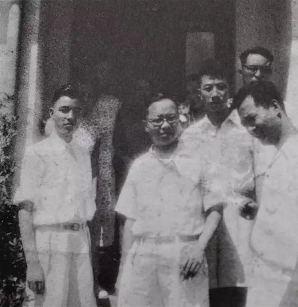 1946年夏,萧乾(前排右)、辛笛(前排中)和靳以(后排右一)等摄于徐汇村(今复旦第二宿舍)22号萧乾家门口