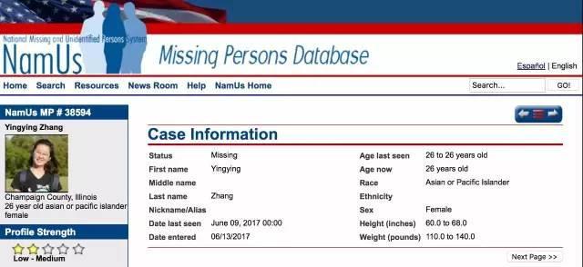 美国“全国失踪和不明身份者系统”网页截图 失踪案件在美侦破率不高 据了解,在美国“全国失踪和不明身份者系统”上共有26046起失踪案件,其中13216起为未结案件,占比为50.74%。这个系统在帮助破案过程中起到“重要作用”的为1675起,比例为13.05%。 联邦调查局不会接手此类调查 该案目前由伊利诺伊大学香槟分校警察局作为地方调查案件承办。上周,联邦调查局派了4名特工协助调查此案。 尚佩恩分校警察局表示,联邦调查局不会接手这类调查。分校警察局和州警察局与联邦调查局有很好的工作关系,所以他们派员参加调查。这是一起非常复杂的调查案件,充分运用地方、州和联邦的执法资源,大大加速了分校警察局处理搜集到的大量信息的过程。 事件回顾:章莹颖失踪案时间链(系当地时间) 6月9日 当地时间6月9日下午两点零六分,章莹颖在校内等待转车时,有一黑色轿车靠近,驾车者疑似为一名白人男子,经短暂27秒的交谈后,章莹颖进入该轿车驶往他处,随后与外界失去联系。 当天晚上,章莹颖导师和同事报警。 6月10日 中午12:30,警方正式立案 6月11日 警方到现场进行取证 6月12日 中国驻芝加哥总领馆开始介入。副总领事余鹏与侨务组、教育组工作人员,一起前往伊利诺伊大学香槟分校,了解章莹颖失踪情况。驻芝加哥总领馆促请警方和校方加大搜寻力度,当天,案件正式移交FBI。 晚11点多,校方警察局查到街道监控视频显示,章莹颖于失踪当日14时左右出现在北古德温大道附近,一辆黑色土星轿车(Saturn Astra)停在章莹颖身旁。