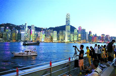 游客在尖沙咀欣赏港岛夜景(2013年7月5日摄)。 新华社发