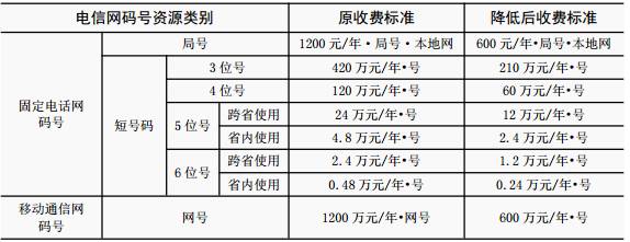 注释: 1、移动通信网占用的码号资源按照实际占用的H0 进行收费;电信业务经营者分配给专用电信网的码号资源按照6 元/年•百层号•本地网收取; 2、西部地区的用户号码资源占用费减半收取(包括重庆、四川、贵州、云南、西藏、陕西、甘肃、青海、宁夏、新疆、内蒙古、广西); 3、公益性短号码免收码号资源占用费,包括110、119、120、122、123xx (“xx”从00-99); 4、信令点编码和数据通信网码号资源暂不收费; 5、400、600、700、800 等智能网业务号码暂不收费; 6、114、117、121、106x(“x”从0-9)、长途过网号的码号资源暂不收费; 7、非固定电话网短号码资源占用费按照固定电话网短号码收费标准收取。 8、党政机关专用网,国际、军事、战备专用网,公安、安全、武警部门专用网等使用的电信网码号资源免收码号资源占用费。 (二)无线电频率占用费 无线电频率占用费不再按2G、3G 单独制定收费标准,统一按实际使用频段进行计费,并降低各频段收费标准,具体为:在全国范围内使用的频段,960 兆赫以下频段由1700 万元/兆赫/年降为1600 万元/兆赫/年,960-2300 兆赫频段由1500 万元/兆赫/年降为1400 万元/兆赫/年,2300 兆赫以上频段由1200 万元/兆赫/年降为800 万元/兆赫/年。在省级范围内使用的频段,960 兆赫以下频段由170 万元/兆赫/年降为160 万元/兆赫/年,960-2300兆赫频段由150 万元/兆赫/年降为140 万元/兆赫/年,2300 兆赫以上频段由120 万元/兆赫/年降为80 万元/兆赫/年。在市(地、州)范围内使用的频段,960 兆赫以下频段由17 万元/兆赫/年降为16 万元/兆赫/年,960-2300 兆赫频段由15 万元/兆赫/年降为14 万元/兆赫/年,2300 兆赫以上频段由12 万元/兆赫/年降为8万元/兆赫/年。 二、公安部门 (一)公民出入境证件费 1、普通护照收费标准,由每本200 元降为每本160 元。因丢失要求补发因私普通护照的,收费标准为每本160 元。 2、出入境通行证收费标准,一次出入境有效由每证20 元降为每证15 元,多次出入境有效由每证100 元降为每证80 元。 3、往来港澳通行证收费标准,由每证100 元降为每证80 元。 前往港澳通行证收费标准,由每证50 元降为每证40 元。 内地居民赴港澳签注的收费标准,一次有效签注由每件20元降为每件15 元,二次有效签注由每件40 元降为每件30 元,短期(不超过一年)多次有效签注由每件100 元降为每件80 元,一年以上(不含一年)两年以下(含两年)多次有效签注由每件150 元降为每件120 元,两年以上三年以下(不含三年)多次有效签注由每件200 元降为每件160 元,长期(三年以上,含三年)多次有效签注由每件300 元降为每件240 元。 4、往来台湾通行证收费标准,电子通行证由每证100 元降为每证80 元,一次有效通行证由每证20 元降为每证15 元。大陆居民前往台湾签注收费标准,一次有效签注由每件20元降为每件15 元,多次有效签注由每件100 元降为每件80 元。 5、台湾居民来往大陆通行证收费标准,电子通行证由每证250 元降为每证200 元,一次有效通行证由每证50 元降为每证40 元。 6、台湾同胞定居证收费标准,由每证10 元降为每证8 元。 (二)机动车行驶证工本费 机动车行驶证工本费标准,由每本15 元降为每本10 元。 (三)临时入境机动车号牌和行驶证工本费 临时入境机动车号牌和行驶证工本费标准,由每本15 元降为每本10 元。 三、水利部门 水土保持补偿费收费标准按下列规定执行: 1、对一般性生产建设项目,按照征占用土地面积一次性计征,东部地区由每平方米不超过2 元(不足1 平方米的按1 平方米计,下同)降为每平方米不超过1.4 元,中部地区由每平方米不超过2.2 元降为每平方米不超过1.5 元,西部地区由每平方米不超过2.5 元降为每平方米不超过1.7 元。 对水利水电工程建设项目,水库淹没区不在水土保持补偿费计征范围之内。 2、开采矿产资源的,建设期间,按照征占用土地面积一次性计征,具体收费标准按照上述规定执行。开采期间,石油、天然气以外的矿产资源按照开采量(采掘、采剥总量)计征。石油、天然气根据油、气生产井(不包括水井、勘探井)占地面积按年征收,每口油、气生产井占地面积按不超过2000 平方米计算;对丛式井每增加一口井,增加计征面积按不超过400 平方米计算,每平方米每年收费由不超过2 元降为不超过1.4 元。各地在核定具体收费标准时,应充分评估损害程度,对生产技术先进、管理水平较高、生态环境治理投入较大的资源开采企业,在核定收费标准时应按照从低原则制定。 3、取土、挖砂(河道采砂除外)、采石以及烧制砖、瓦、瓷、石灰的,根据取土、挖砂、采石量,由按照每立方米0.5-2 元计征(不足1 立方米的按1 立方米计,下同)降为按照每立方米0.3-1.4 元计征。对缴纳义务人已按前两种方式计征水土保持补偿费的,不再重复计征。 4、排放废弃土、石、渣的,根据土、石、渣量,由按照每立方米0.5-2 元计征降为按照每立方米0.3-1.4 元计征。对缴纳义务人已按前三种方式计征水土保持补偿费的,不再重复计征。上述各类收费具体标准,由各省、自治区、直辖市价格主管部门、财政部门会同水行政主管部门根据本地实际情况制定。