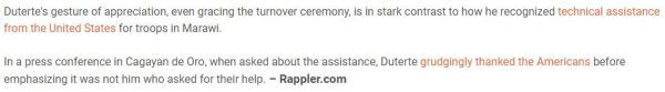 菲律宾媒体报道截图:杜特尔特“很不情愿地”对美方表示感谢。 中国的支持“只是刚开始” 在28日的交接仪式上,备受外媒关注的,还有来自中国驻菲律宾大使就中菲合作反恐释放的积极信号。 新加坡《联合早报》引用赵鉴华大使的话说:“恐怖主义是中国和菲律宾共同面对的敌人,这将我们两国军队结合在一起。为了进一步加强在这些方面的合作,中方想表达进行打击恐怖主义的联合训练、情报共享和联合军演的可能性。” 中国大使同时承诺,此次捐赠的武器装备“只是刚开始”,“中方在准备第二批的捐赠,将在未来几个月内移交给菲律宾。” 此外,赵大使还宣布,将追加500万比索(约合70万元人民币)给殉职士兵们的家属及受伤的士兵。他说,中国不仅帮助打击恐怖主义,也将帮助重建受冲突影响的地区。 “在关键时候,在菲律宾迫切需要军事援助的时候,我们这一次提供的援助时机是非常恰当的。”中国社科院研究员许利平告诉参考消息网-锐参考。他认为,这不仅有助于中菲的政治互信,也将推动两国在军事上的进一步合作。” 许利平认为,此次菲律宾国内的反恐行动中,也暴露出一些短板,如武器比较落后,军事技术也不够先进,使得其需要来自美国的军事帮助,“这实际上又把菲律宾推向了美国一边,对于中菲关系带来不利因素。”因此,中国及时提供援助,“正是时候”。