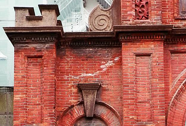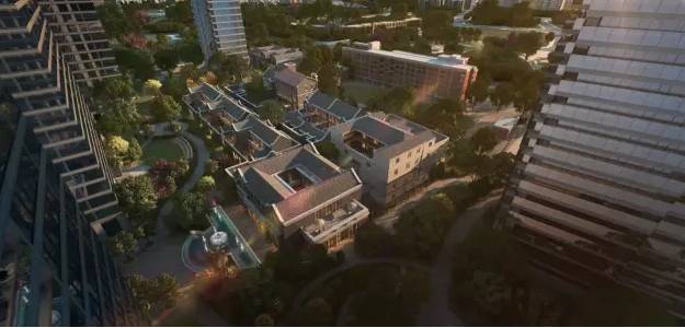 沈宅,一幢始建于1860年,157年历的大宅院。它位于上海的老城厢——花衣街116号,外滩万国建筑群落当中,它的主人沈义生是晚清“朱、王、沈、郁”四大沙船巨商之一。 沈宅具有浓郁的江南民居特色,保留传统的基础上在细部采用了西方古典建筑风格。从现今留存下来的红砖拱券、砖作仪门、镂雕精细的翼状木饰,细致精美之处仍能让人感受到当年那个盛极一时的沈家大宅的风采。 见证了上海民族商业的百年变迁的沈宅,可能是150年前上海外滩的房子的唯一一个记忆节点了。 老宅所在位置,正好位于“绿城黄浦湾”园区红线边界。如果原址修复必然会突破用地红线,涉及规划调整,困难重重,为了更好地保护这座百年建筑,绿城对这座宅院进行了整体平移。 平移后的效果图(二排白墙建筑)