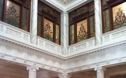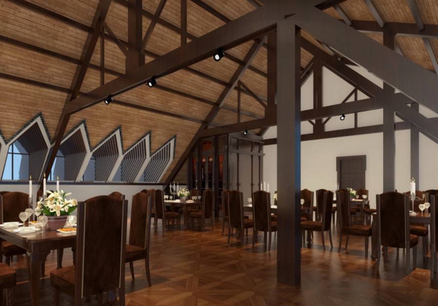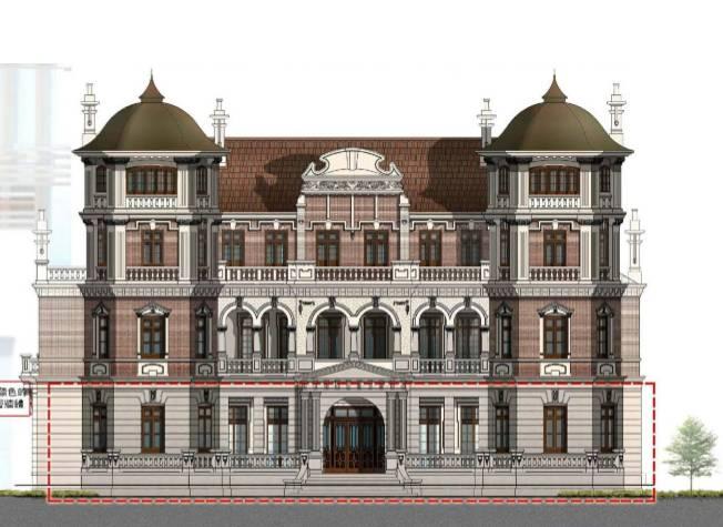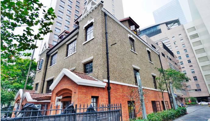 这是两幢中西合璧的花园洋房:清水红砖墙,人字形屋面,红色平瓦铺盖。正面为新古典主义建筑风格,巴洛克式山墙、欧式外廊;北立面则有江南水乡建筑的特色,被建筑界的行家们成为艺术品。 西侧的洋房因在抗日战争期间出卖给汉奸顾焕章,抗战胜利后收归公有,在做了一阵子“新生活”俱乐部后被拆除。东侧的建筑在1940被民立中学买下,成为现在大家熟知的民立中学4号楼。 2010年2月,因地铁13号线以及大中里(今兴业太古汇)项目的规划建造,这栋近百年历史,面积达1780㎡的大宅整体东南方向整体平移了57.6米,同时还升高了0.4米。这也是魔都第一例采用爬坡升高的建筑物平移。 南立面修复效果图 室内修复效果图