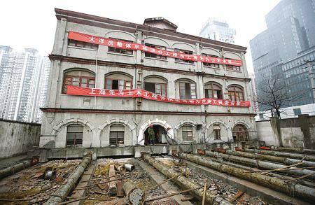 浦东东方路11号有个叫大洋房的假四层(三层+阁楼)老建筑,正经名字叫“上海市江海北关验货场办公楼”。1906年,因为通商货物多,为了对检验工作进行管理而建成的,如今大洋房已经111岁高龄。 2010年,为了配合博配套工程、浦东滨江大道的建设,已经104岁高龄的上海浦东大洋房开始了“平移”历程。相比较之前那些老建筑的平移,年逾古稀的大洋房的搬家过程格外不易。 因大洋房二三楼内部几乎没有支撑墙(内部是木隔假墙,不是砖墙),而一楼的房间纵向墙体又不在一条直线上,结构出乎意料的脆弱。为加固而交错架设的钢桁架让大楼看上去犹如一座盘丝洞。五花大绑后的建筑推进力仍然很难平衡。