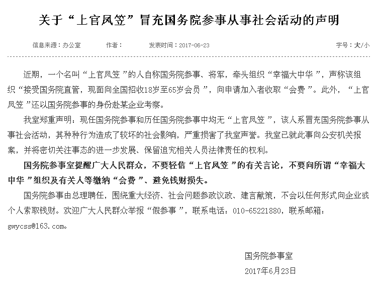 冒充国务院参事,这胆子可真不小。他为什么要冒充?又做了什么事儿让国务院参事室报警? 参事室接到群众邮件投诉 国务院参事室发声明是6月23日的事儿。声明中说,一个名叫“上官凤笠”的人自称国务院参事、将军,牵头组织“幸福大中华”,声称该组织“接受国务院直管,现面向全国招收18岁至65岁会员”,向申请加入者收取“会费”。此外,“上官凤笠”还以国务院参事的身份赴某企业考察。 对此,参事室郑重声明:现任国务院参事和历任国务院参事中均无“上官凤笠”,该人系冒充国务院参事从事社会活动。
