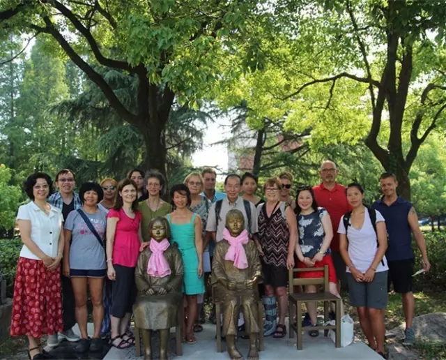 2017年7月15日上午,和平与和解亚洲考察之旅参访团成员参观中国“慰安妇”历史博物馆,并与上海师范大学中国“慰安妇”问题研究中心陈丽菲教授进行交流与会谈。 参访团成员一行共17人,分别来自美国、加拿大、香港等不同的国家与地区。在中韩慰安妇”和平少女像前聆听陈丽菲教授的讲解后,成员们对少女像的有关知识非常感兴趣,并就少女像紧握的拳头、少女像身戴丝巾的寓意等细节向陈丽菲教授提问。 ![]() 陈丽菲教授(前排左一)与参访团成员在少女像前合影 随后,成员们参观了位于上海师范大学文苑楼二楼的中国“慰安妇”历史博物馆,博物馆研究生志愿者按照博物馆资料及物证的展示顺序,介绍了日军“慰安妇”制度的内容与馆藏珍贵文物。参访团成员纷纷热情的购买了馆藏书籍、纪录电影《三十二》DVD以及《二十二》少女像纪念章,并向陈丽菲教授索要签名。 学生志愿者为参访团成员讲解博物馆珍贵馆藏 ![]() 参访团成员认真阅读展板上的内容 参观结束后,成员们与陈丽菲教授于博物馆放映室举行了座谈会。陈丽菲教授细致入微的为大家讲述了日军“慰安妇”制度的相关历史知识、“慰安妇”幸存者的现状以及20多年间中国“慰安妇”问题研究中心研究员调查、走访“慰安妇”幸存者的情况。与会成员也向陈丽菲教授提出了不少如“慰安妇”制度与南京大屠杀中发生的大规模性暴力的本质区别等专业性、有价值的问题。对此,陈丽菲教授也耐心的一一进行答复。 访谈结束后,全体成员一同观看了“慰安妇”题材纪录电影《三十二》。 活动结束后,美国新泽西州抗日战争史实维护会Don M.Tow先生代表新泽西州史维会向研究中心捐款,用以援助“慰安妇”幸存者。 美国新泽西州抗日战争史实维护会代表Don M.Tow向研究中心交付捐款凭证 ![]() 成员们向陈丽菲教授、苏智良教授及其团队的工作与坚持表示了敬佩和感谢,并表示此次的参访活动非常精彩,通过参观与座谈,对日军“慰安妇”制度和中国“慰安妇”幸存者的状况有了进一步的了解。团队计划继续前往上海“大一沙龙”、“海乃家”慰安所旧址及日本海军下士官兵集会所旧址,进行实地考察。 (责任编辑:晓歌) |