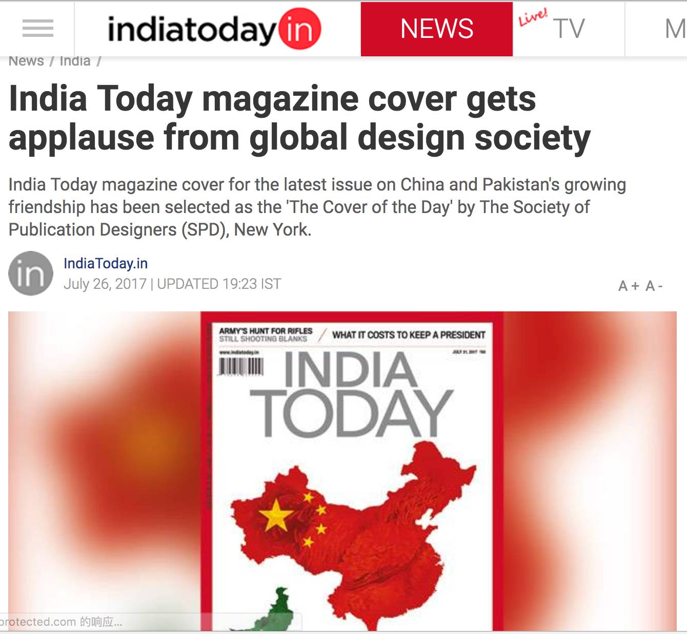 杂志封面截图 文章内容不过是老调重弹,讲中国如何利用巴基斯坦钳制印度,中巴军事合作如何威胁印度,宣称“遏制中巴轴心”是印度外交重中之重。 但重点是封面。 我们的西藏、台湾呢?! 故意从中国版图中删除西藏、台湾,《今日印度》想表达什么呢? 不仅如此,该杂志26日称,其最新封面因设计独特、受到美国出版设计师协会(SPD)青睐,入选“当日最佳封面”。